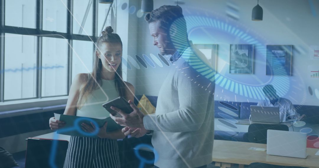 This scene shows two coworkers collaborating in an open-plan office while analyzing information on a digital tablet and a folder. The presence of digital overlay elements symbolizes focus on technology and data. Ideal for illustrating concepts of modern teamwork, innovation in business, and contemporary workspace dynamics.