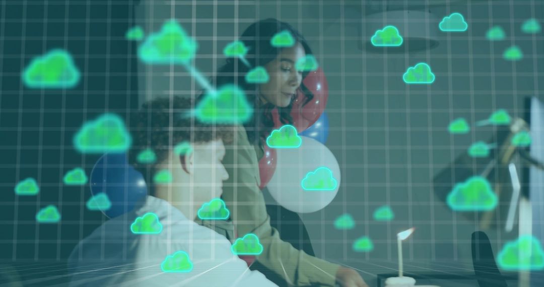 Foreground showing two colleagues leaning toward monitor with teal cloud icons floating across grid overlay, creating futuristic data visualization atmosphere. Balloons in background adding celebratory accent and casual office energy. Composition working well for cloud services, SaaS product pages, DevOps or IT team concept, and corporate technology marketing. Use for website hero banners, landing pages, blog headers, presentation slides, case studies, whitepapers, recruitment campaigns, internal communications, and social media ads. Color palette favoring teal and cool tones for modern tech branding. Cropping suggestions: wide horizontal crop for web banners or tight crop on faces for testimonial and team profile layouts. Visual theme emphasizing collaboration, cloud migration, hybrid work, data analytics, and product launch celebration.
