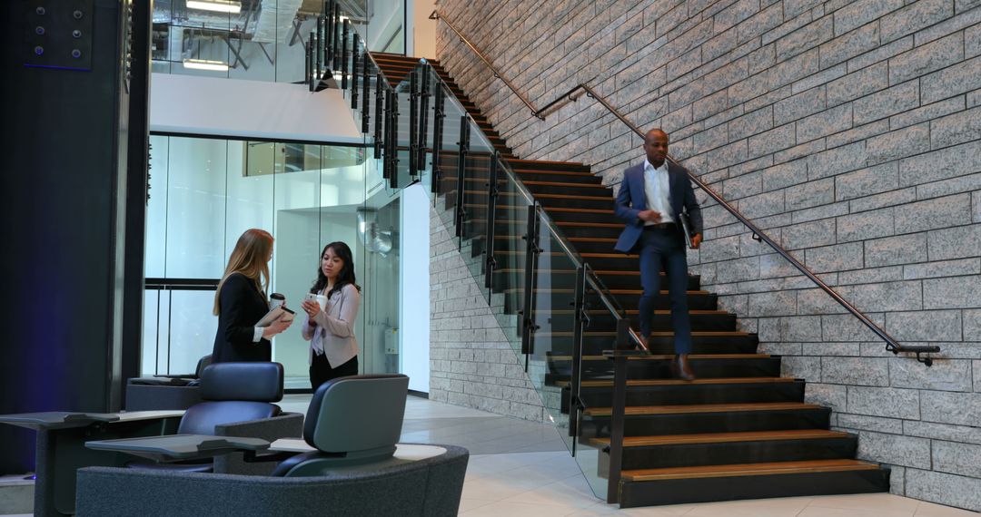 Colleagues Conversing in Modern Office Lobby Image