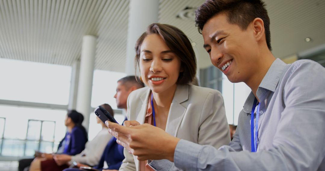 Colleagues engaging in vibrant discussion while using mobile phones during a seminar. Suitable for illustrating workplace collaboration, entrepreneurship, team building, and business communication. Ideal for educational materials or business and tech content.