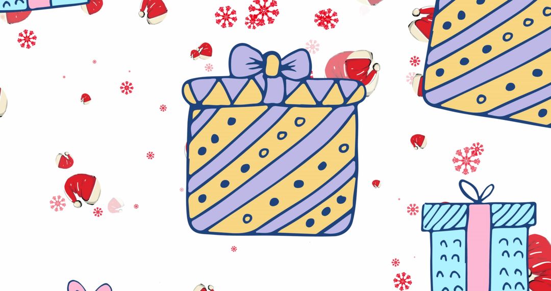 Colorful gift boxes with bows and stripes create lively festive pattern against dotted winter background. Great for holiday wrapping paper designs, festive greeting cards, or seasonal party invitations. Adds cheerful and joyful feel perfect for emphasizing Christmas themes in different design projects.