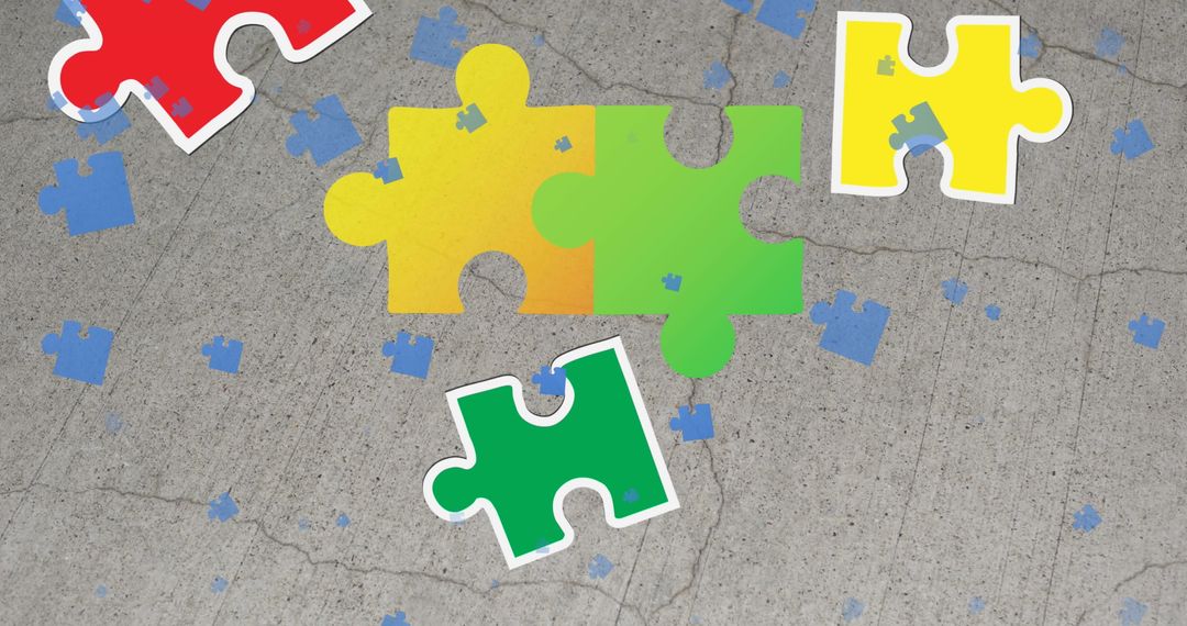 Vibrant puzzle pieces scattered on cracked gray surface illustrate leisure and recreation. Ideal for education and gaming concepts, promoting problem solving and creativity.