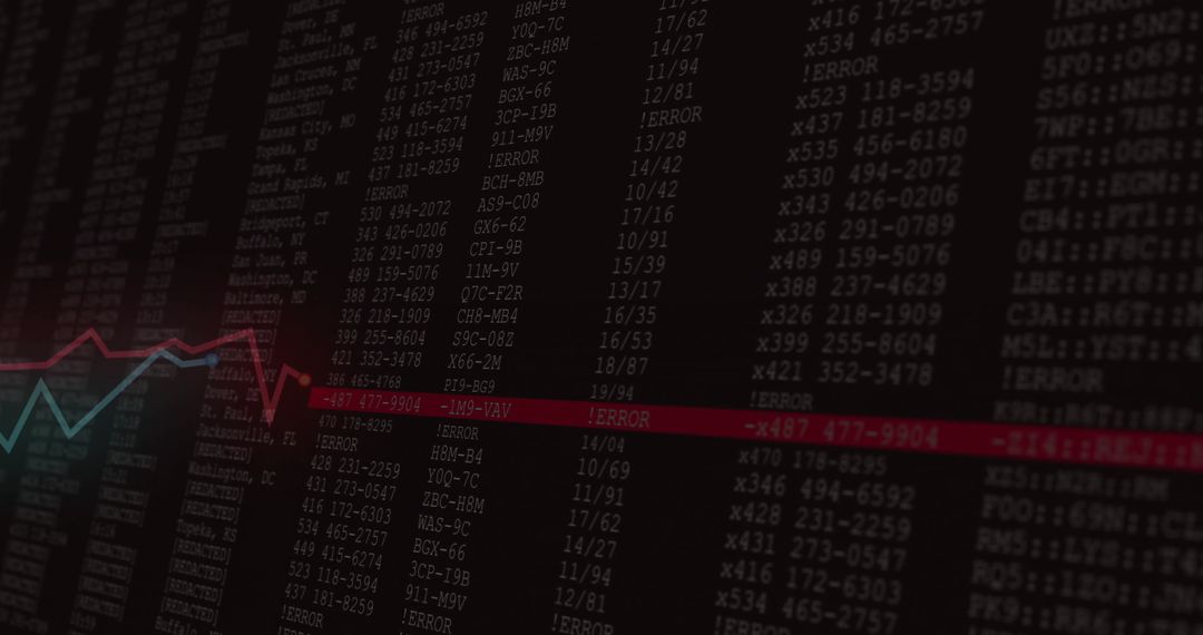 This image displays a computer monitor filled with rows of numerical data and error messages. Adding lines of teal and red graphs, it offers a digital and futuristic feel. Ideal for depicting concepts related to data analytics, monitoring systems, cybersecurity threats, or software programming. Use this for technology blogs, articles about cybersecurity, or presentations on data monitoring.
