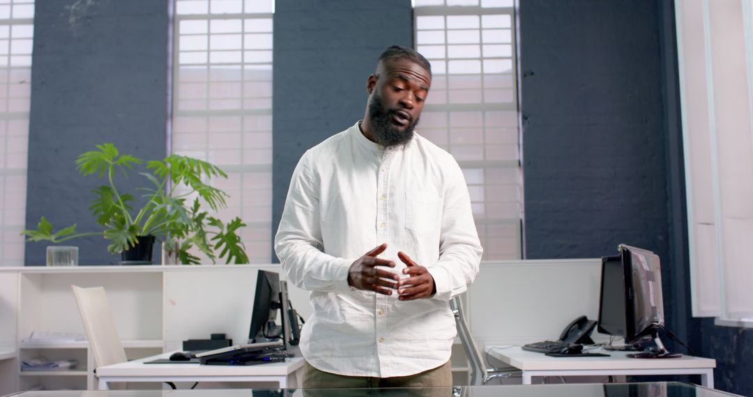 Businessman standing in a contemporary office speaks confidently to camera. Equipped with desks, plants, and computers, the setting embodies a professional work environment. Suitable for materials focusing on corporate presentations, leadership skills, or digital marketing.