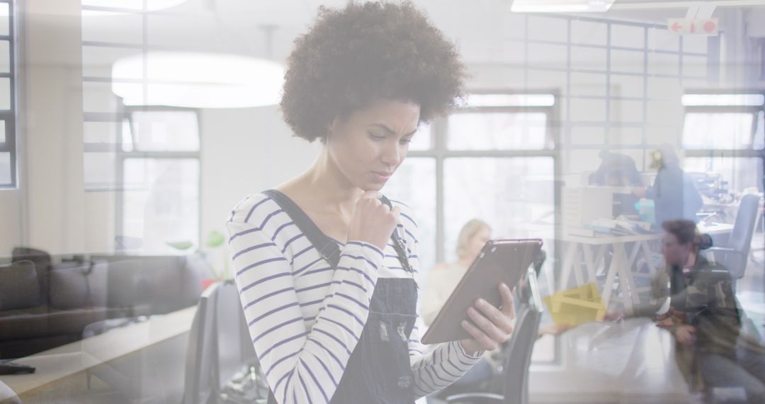 Businesswoman depicted in transparent office background holds tablet while concentrating. Represents themes of digital transformation, modern business practices, and global communication. Useful for promoting technological integration in business, digital solutions or modern work environments.