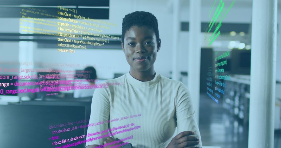 This stock photo portrays an African American businesswoman confidently smiling while engaged in a tech-inspired office space. Visible data graphics and coding elements overlay the scene. Ideal for illustrating themes of digital transformation, women in technology, data analysis, or modern office environments in blog posts, marketing materials, or tech presentation slides.