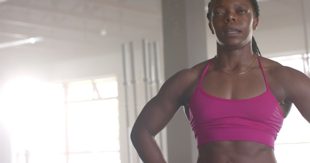 - Confident Fit Woman Posing in Gym with Muscular Physique