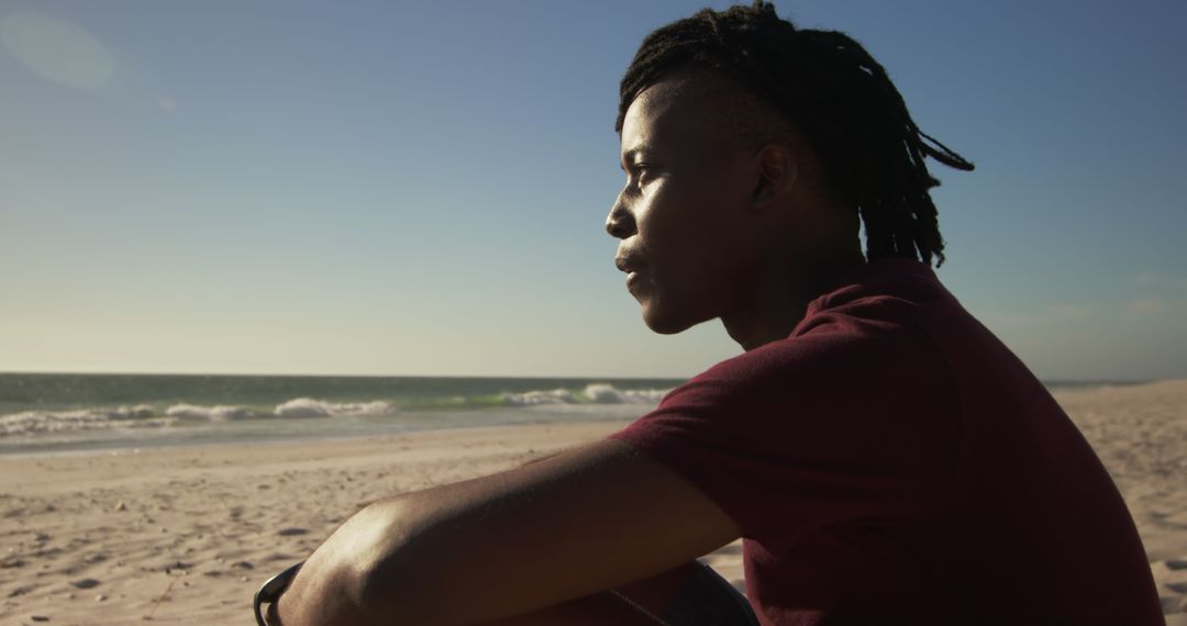 A young African American man sits on the sandy beach, gazing into the distance on a sunny day. The tranquil sea and clear blue sky create a serene atmosphere, perfect for relaxation and introspection. This can be used in travel magazines, wellness promotions, or imagery focused on relaxation and mental health retreats.