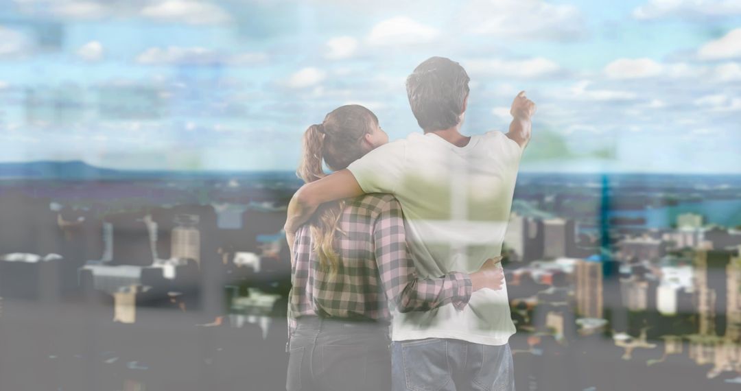 A couple is standing close together, gazing at an expansive city view and discussing their future. This imagery incorporates a digital overlay suggesting a blend of dreams or plans with reality, depicting themes of future planning and mutual aspirations. Useful for articles and campaigns focused on real estate, technology integration, emotional wellness, or futuristic city planning.