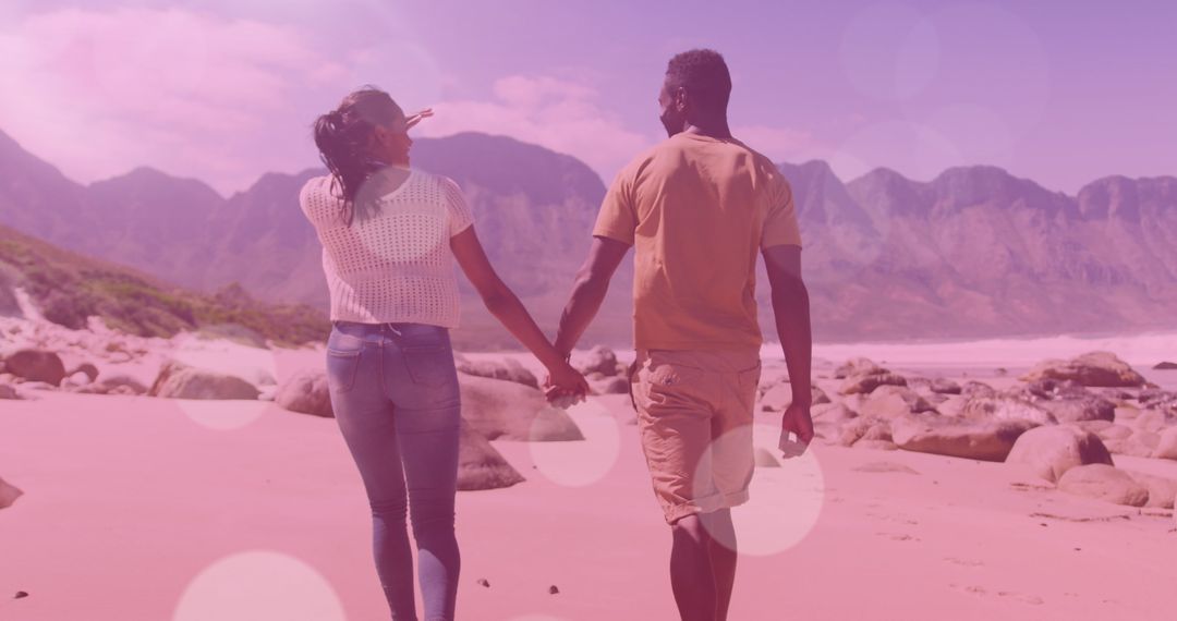 Young African American couple enjoys a tranquil walk on a sunlit beach, holding hands to signify love and connection. This image conveys themes of relaxation and romance, ideal for travel brochures, relationship articles, or inspirational content.