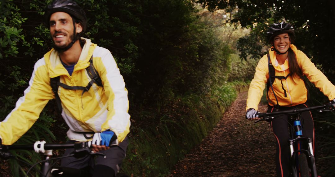 Young Caucasian man and woman are biking through a picturesque forest trail. This outdoor adventure reflects a lively and health-conscious lifestyle, as shown by their bright yellow jackets and joyful behavior. Ideal for use in travel brochures, health and fitness campaigns, or any content highlighting active living in nature.
