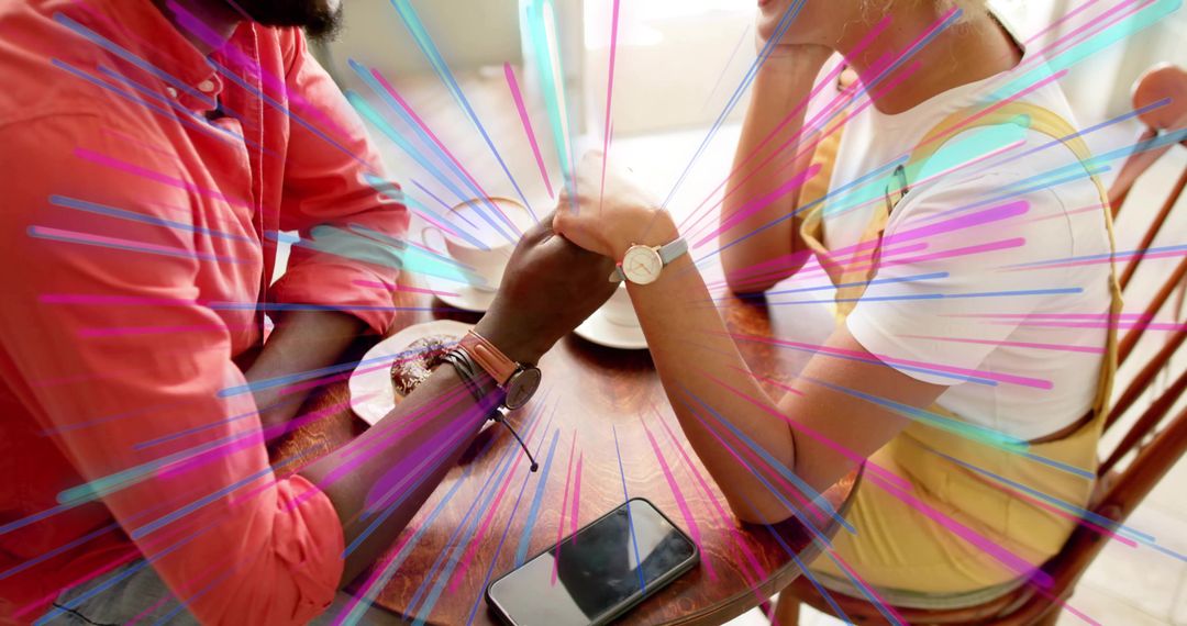 Setting captures emotional intimacy as couple holds hands above a cafe table. Exploding colorful rays emphasize warmth and connection, combining technology with romance through hints of a smartphone. Useful for themes of modern romance, social interaction, and lifestyle blogs.