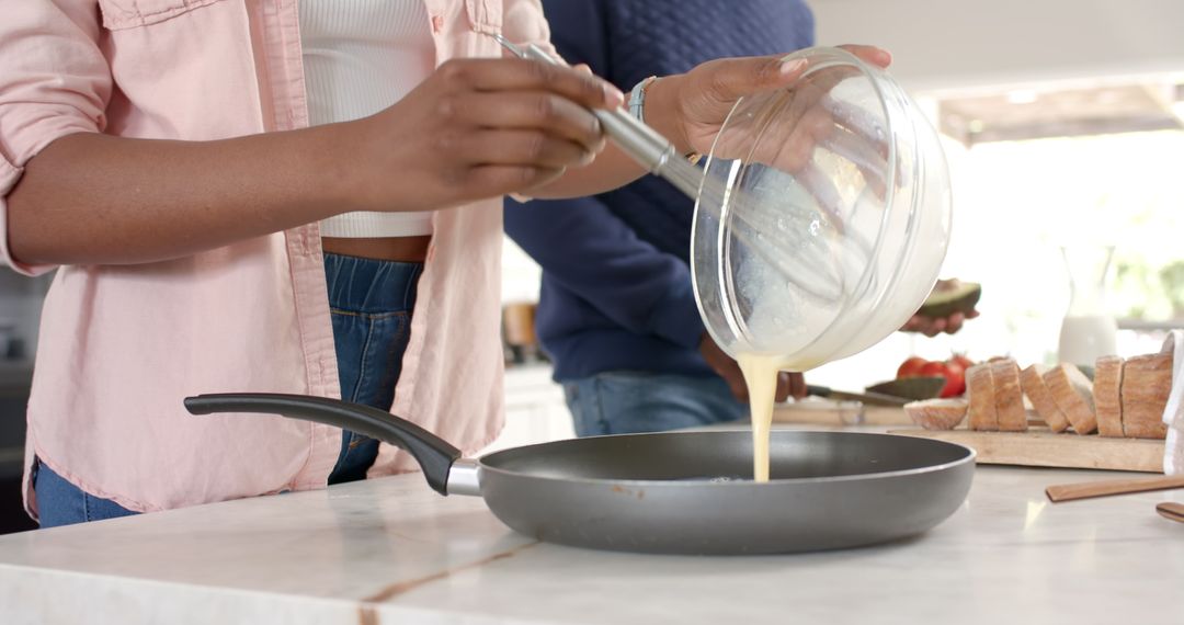 An image of a couple in a contemporary kitchen pouring batter into a frying pan. In the background, slices of avocado and a loaf of bread are on the countertop, indicating preparation for breakfast or a brunch meal. This image conveys a sense of home, culinary delight, and the joy of cooking together. It is suitable for use in lifestyle blogs, cooking websites, and advertisements stressing home-cooked meals and modern relationship dynamics.