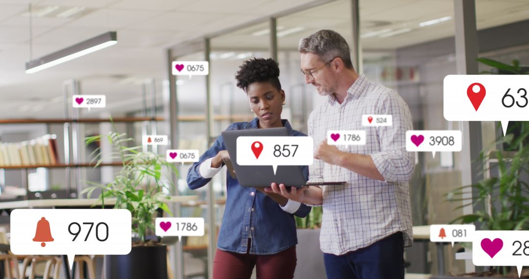 Diverse coworkers in a bright, modern office discuss social media analytics displayed on a laptop screen. Various notification icons float around them, indicating engagement metrics like likes, comments, and reminders. Ideal for illustrating themes of business analytics, teamwork, digital strategy development, or social media management strategies.