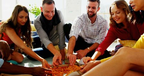 - Coworkers Enjoying Pizza Together in Modern Office Lounge