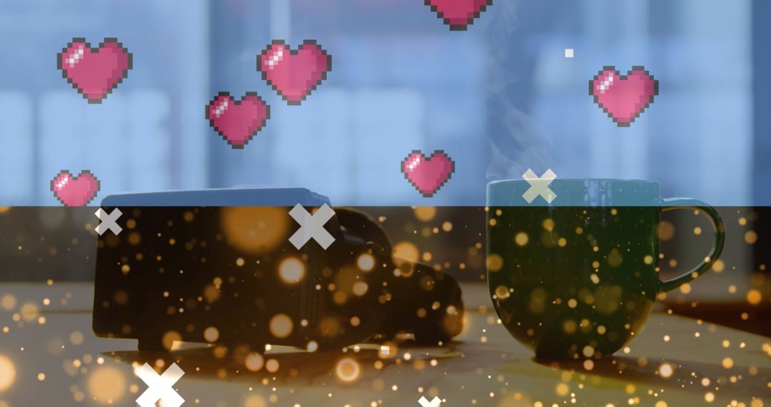 An imaginative juxtaposition of a virtual reality headset with a coffee cup emitting steam, overlaid by bright heart icons. This composition showcases a fusion of technology and daily life, evoking themes of relaxation and digital interaction. Ideal for illustrating articles or blog posts on technology innovations, gaming culture, and tech’s influence on everyday experiences.