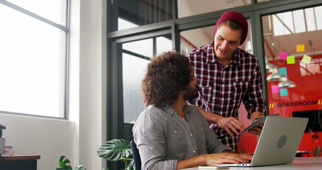 Two male colleagues engage in discussion, one seated at a laptop while another references a tablet, fostering a collaborative and creative work environment. Ideal for representing teamwork themes, modern office culture, technology interaction, and professional partnerships.