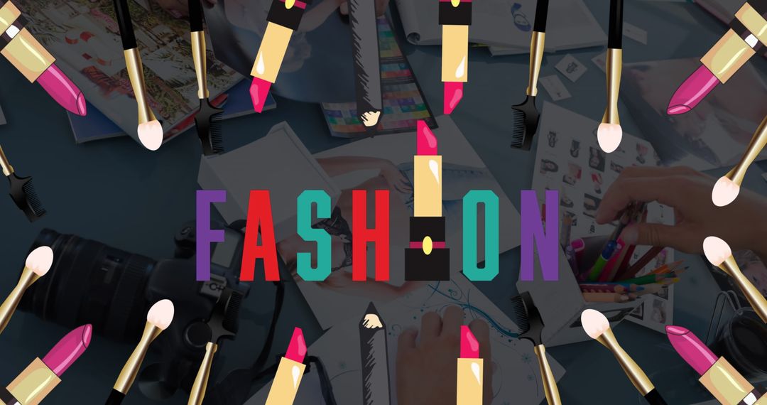 Design featuring colorful cosmetics icons creatively overlaying fashion studio scene with tools and sketches, highlighting design creativity in fashion. Use for fashion marketing, design showcase, or educational materials in fashion industry.