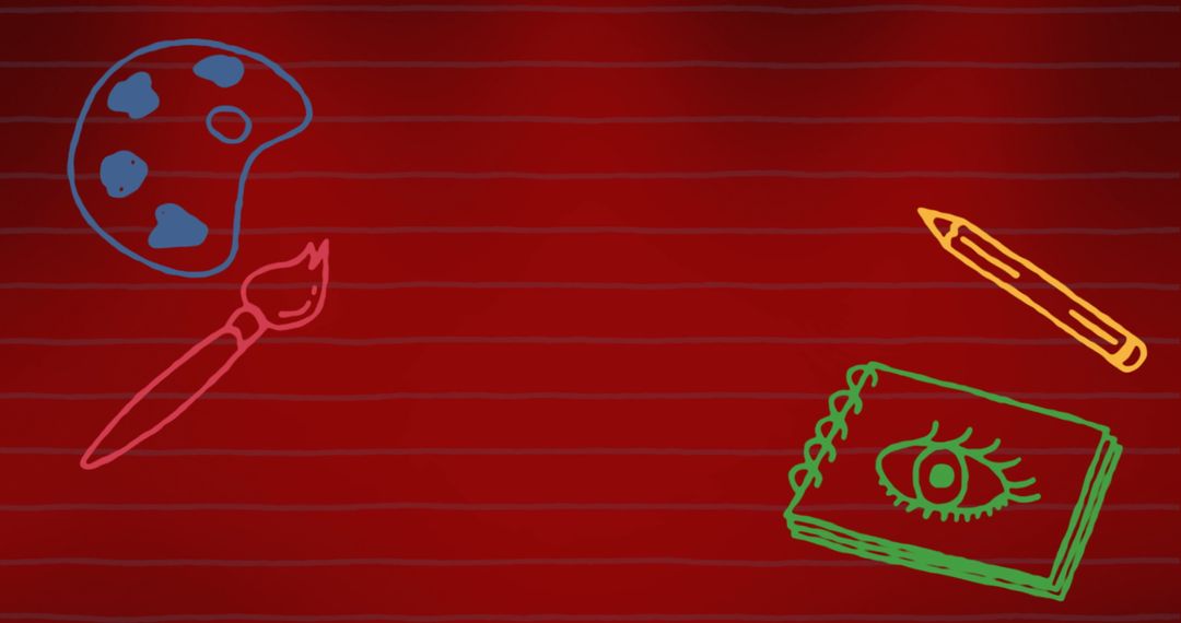 Colorful and engaging school-themed illustrations including a paint palette, brush, pencil, and sketchbook with eye illustration are scattered on a vibrant red lined background. This image is ideal for educational materials, flyers, back-to-school promotions, or as a fun backdrop for digital content related to learning and creativity.