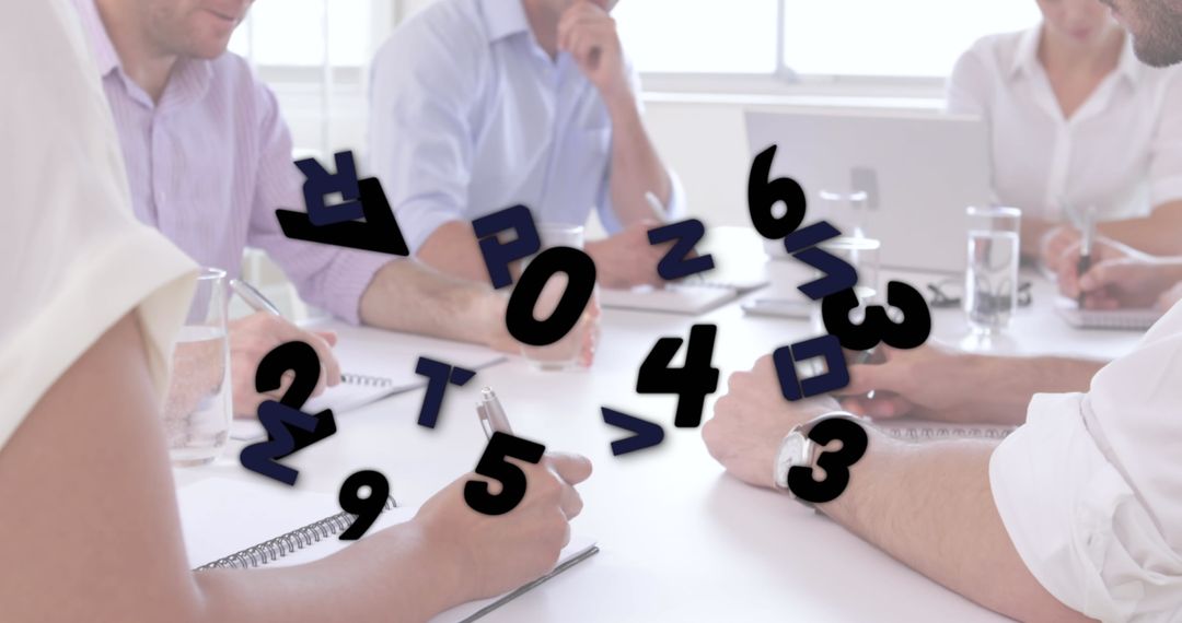 Members of a corporate team collaborate around a bright office table, focusing on business strategies. Digital numbers and letters overlay, symbolizing innovation and digital transformation, enhance dynamics. Suitable for depicting modern teamwork, creative thinking in a corporate environment, and the push towards digital innovation.