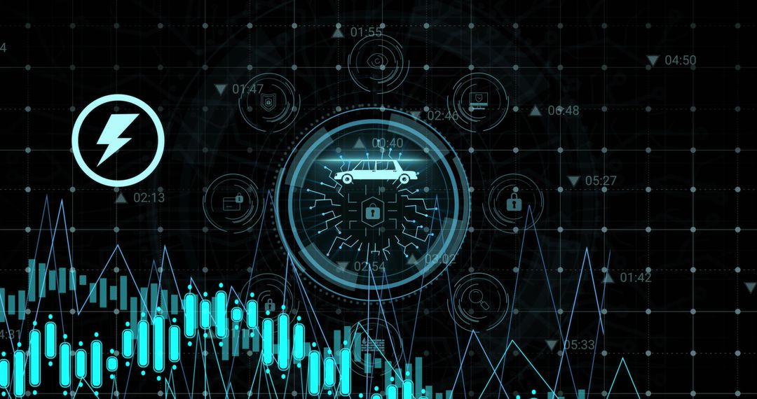 Image features abstract representation of cybersecurity and data analysis, including lock and car icons with circuit board elements. Visual motifs incorporate energy symbol and fluctuating graphs on a black digital grid, signifying technological infrastructure and protection. Perfect for topics relating to data security in automotive technology, energy management, and network visualization. Potential use in articles, presentations, and marketing materials centered on cybersecurity and technological innovations.