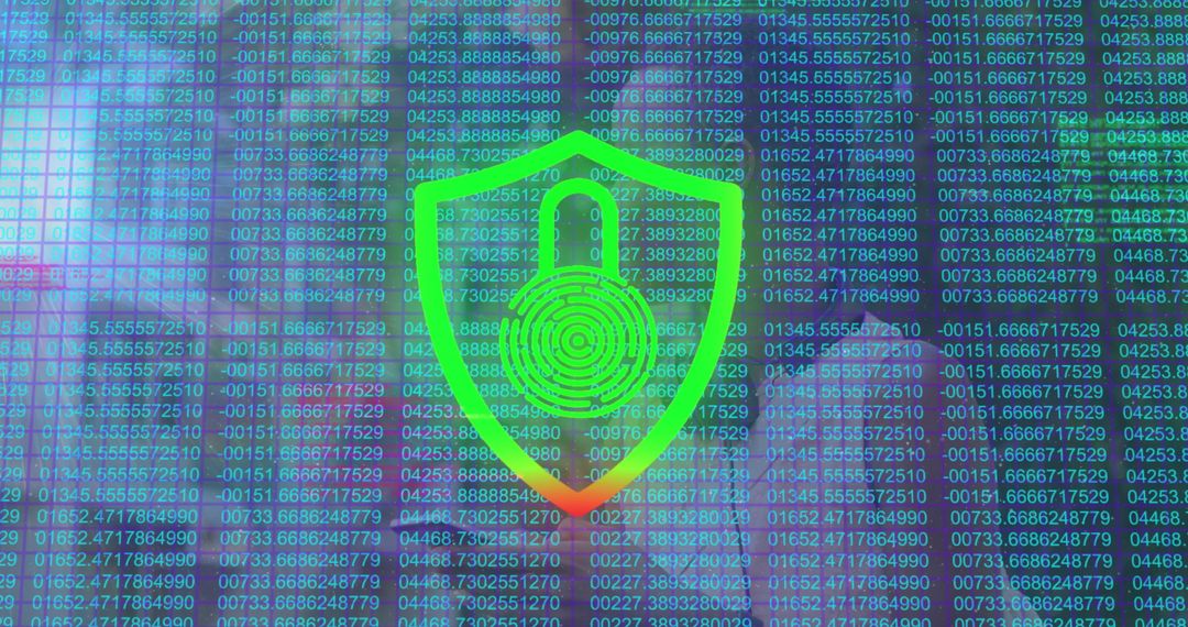 The image presents a digital security theme with a prominent green shield icon superimposed over a backdrop of numerical data. A padlock shape within the shield emphasizes encryption and safeguarding of information. A fingerprint pattern hints at modern authentication methods. Useful for illustrating cybersecurity topics, online protection strategies, IT security solutions, or digital privacy features in presentations, articles, and educational content.