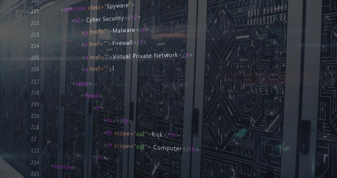 Cybersecurity in Modern Data Center with Server Cabinets and HTML Code Image