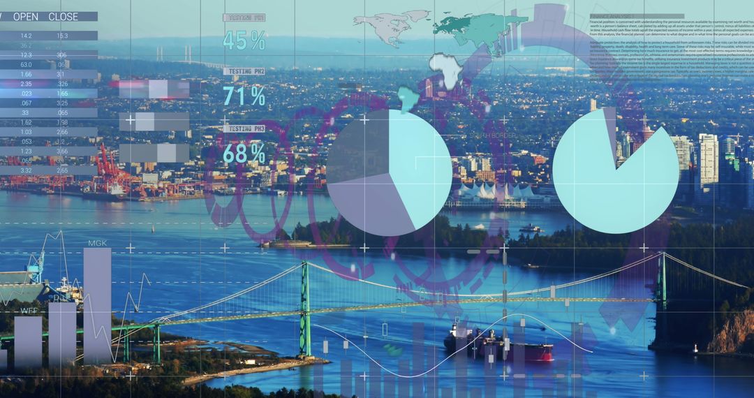 This illustration combines visual data representations such as pie and bar charts overlaying a panoramic view of a suspension bridge in a coastal city. Perfect for presentations related to urban development, infrastructure projects, maritime logistics, and commerce analytics, showcasing interaction between city environments and data flow. Ideal for articles about smart city planning and innovations in transport logistics.