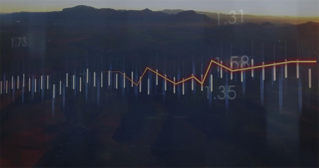 This image creatively combines the serenity of a mountain landscape at dusk with dynamic data visualization elements. It displays white bars, a prominent yellow trend line, and numerical labels, signifying variable changes or statistics. Ideal for use in presentations that marry nature and analytics, it could effectively illustrate data trends or support abstract themes related to growth, analytics, and the blend of natural and digital worlds.