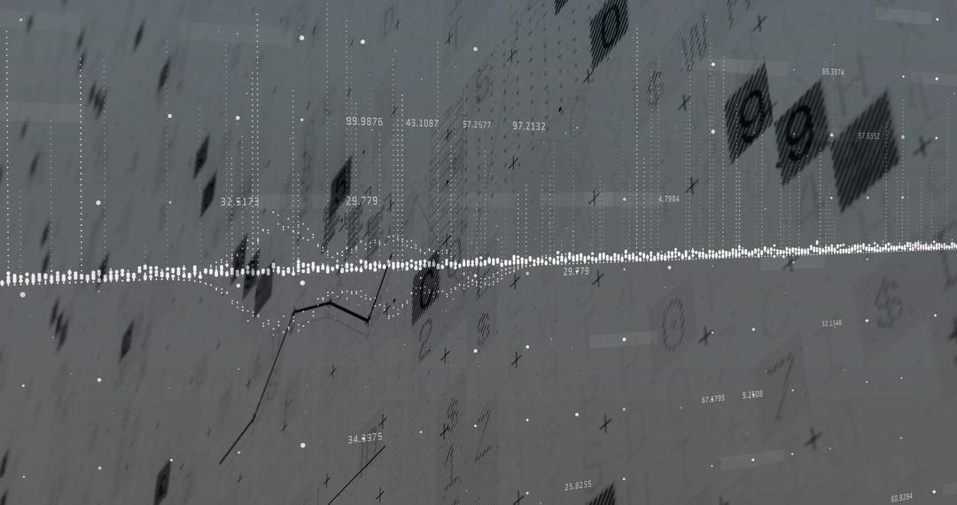 Depicts a technology interface focused on analytics and data visualization, highlighting complex numeric clusters, chart lines, and a waveform against a grid background. Useful for conveying concepts in data analysis, technology support tools, or interfaces in presentations and marketing for software or tech innovations.