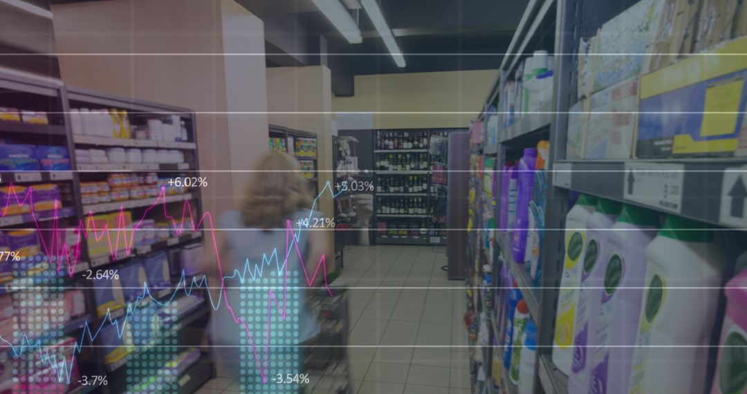 Overlaid statistical graphics on shopping environment showcasing market trends and consumer behaviors, suitable for illustrating themes related to retail data analysis, economic studies, or business marketing strategies. Potential use in presentations by market analysts, business developers, or educational materials examining economic impacts on purchasing trends.