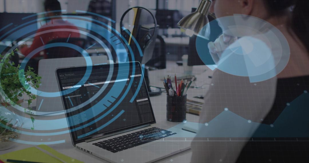 - Developer coding on laptop in open-plan office with futuristic data visualization overlays