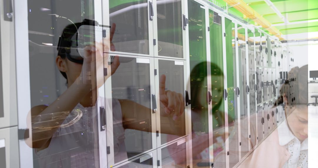 Child interacts with virtual reality environment while servers symbolize backbone of digital innovation. Image suggests integration of VR in education, making it a rich resource for promotional materials related to technology, digital transformation in education, and future-driven initiatives.