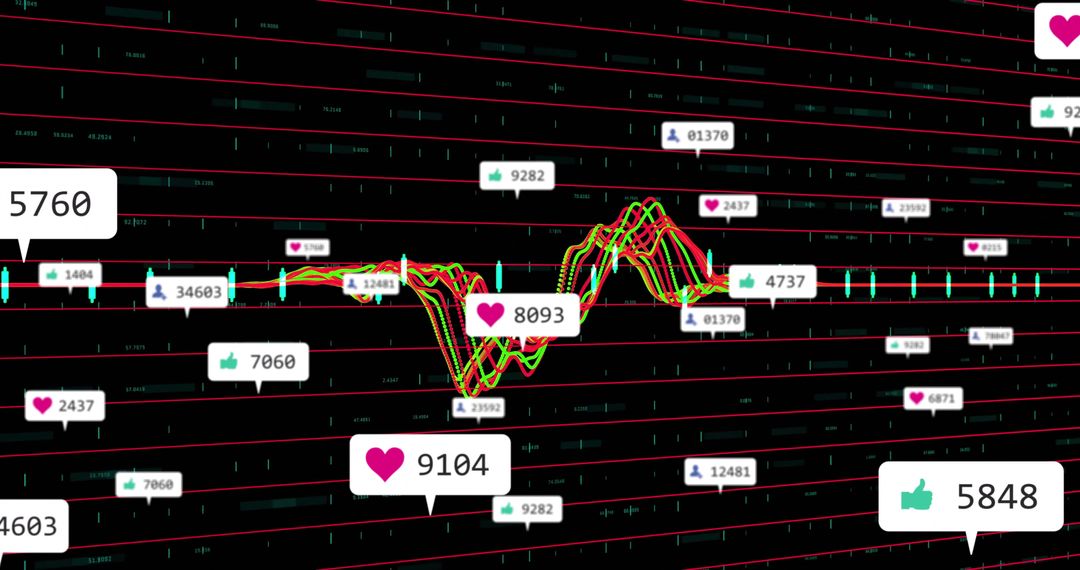 Visualization of data analytics featuring graphs with overlayed thumbs-up and heart icons, along with numerical metrics in bubbles. Useful for illustrating trends in social media communication, interface design for analytic software, or showcasing interactive data reports for projects focused on behavior tracking in digital platforms.