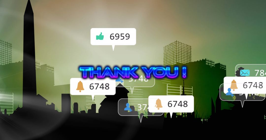 This image shows vibrant 'Thank You' text with notifications over a cityscape backdrop, conveying global digital connections and appreciation messages. Suitable for illustrating social media engagement growth, digital communication, or online networking concepts. Ideal for marketing materials, blogs on social media trends, or digital interfaces visualization.