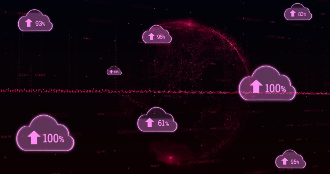 Visualizes concept of cloud computing with percentage updates, suggesting global ICT connectivity and data transfer effectiveness. Ideal for illustrating topics in technology blogs, cloud services presentations, or digital business reports highlighting growth and global reach.