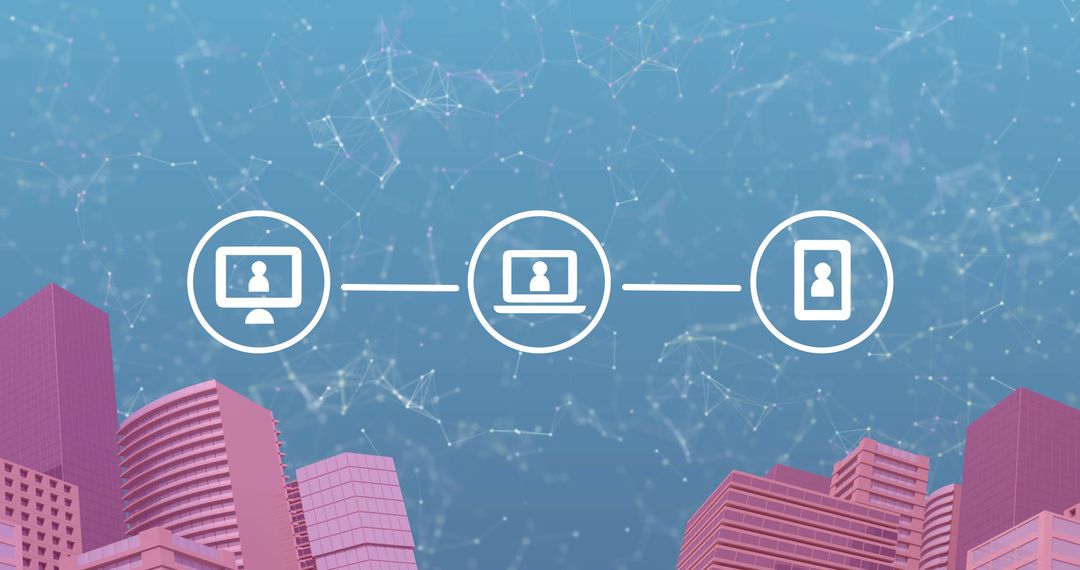 Conceptual representation of interconnected technology icons above city buildings illustrates modern communication and digital security. Perfect for marketing tactical products reminsicent of innovation, headline blog posts on cyber protection, or illustrating articles about online data sharing and digital networking.