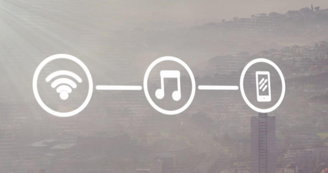 Visual representation of modern networking technology with wifi, music, and smartphone icons superimposed over a cityscape. Useful in illustrating concepts of urban connectivity, smart cities, or the impact of technology on urban environments, for articles, presentations, or educational materials about digital advancements.