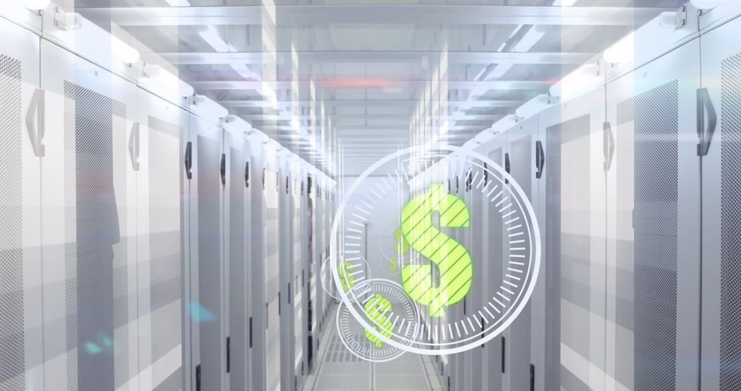 - Digital Dollar Symbols Over Server Rows in Data Center