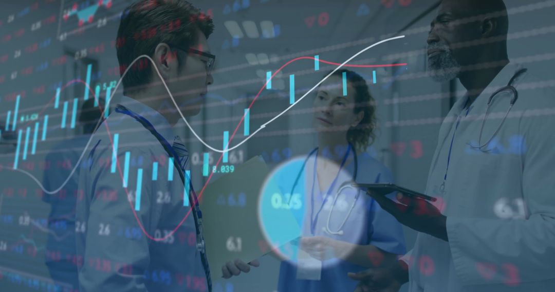 Medical professionals in discussion with a backdrop of financial data and graphs, showcasing their engagement with digital innovation in the health industry. Useful for illustrating themes of technology in healthcare, global medical advancements, and interdisciplinary cooperation in medicine. Perfect for articles or presentations focused on futuristic healthcare solutions and the integration of technology.
