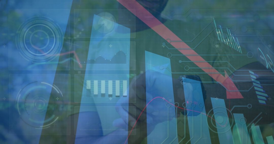 Visual blending technology and interaction, showing data processing in real estate, finance or tech project proposals. Demonstrates technological progress richness multi-industry’s tools.Features man suing informative wearable devices.