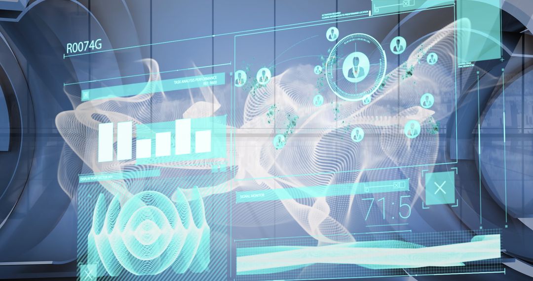 This illustrates a complex digital interface showcasing data processing and global connectivity. The image includes elements like graphs, analytics data, and communication symbols. Ideal for presentations on technology, artificial intelligence, digital transformation, and modern business practices, highlighting futuristic technologies in data management and digital communication.