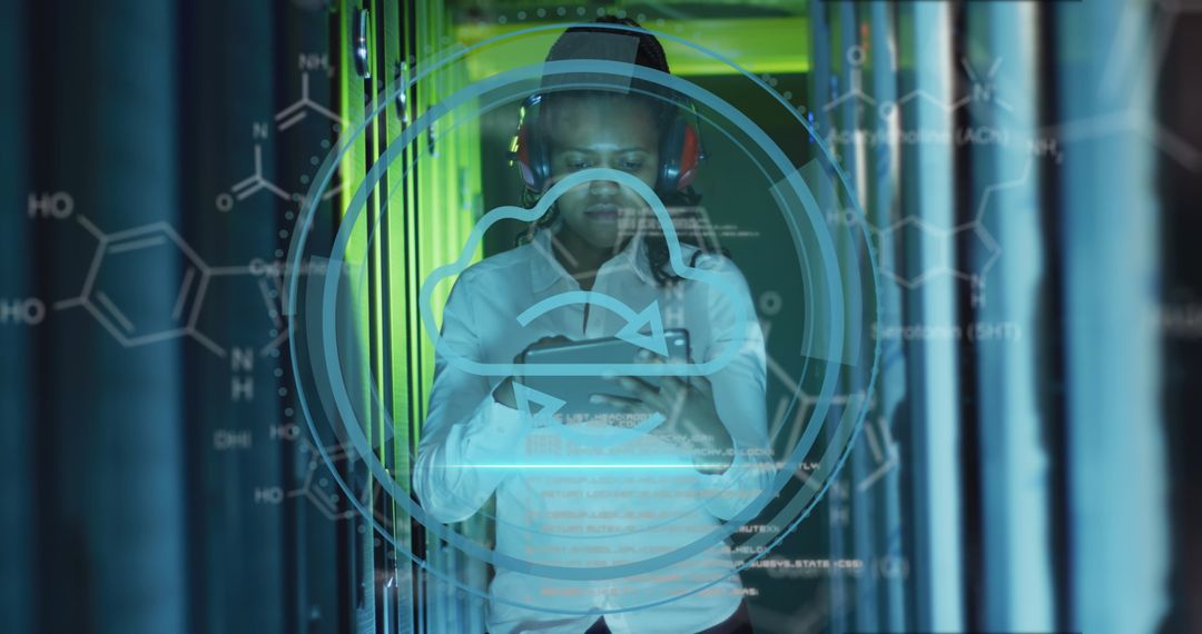 Image depicts African American female worker in a modern server room, interacting with digital interface visuals and molecular graphics symbolizing data processing and global connectivity. Suitable for illustrating technology advances, digital businesses, networking infrastructure, and the role of women in tech.