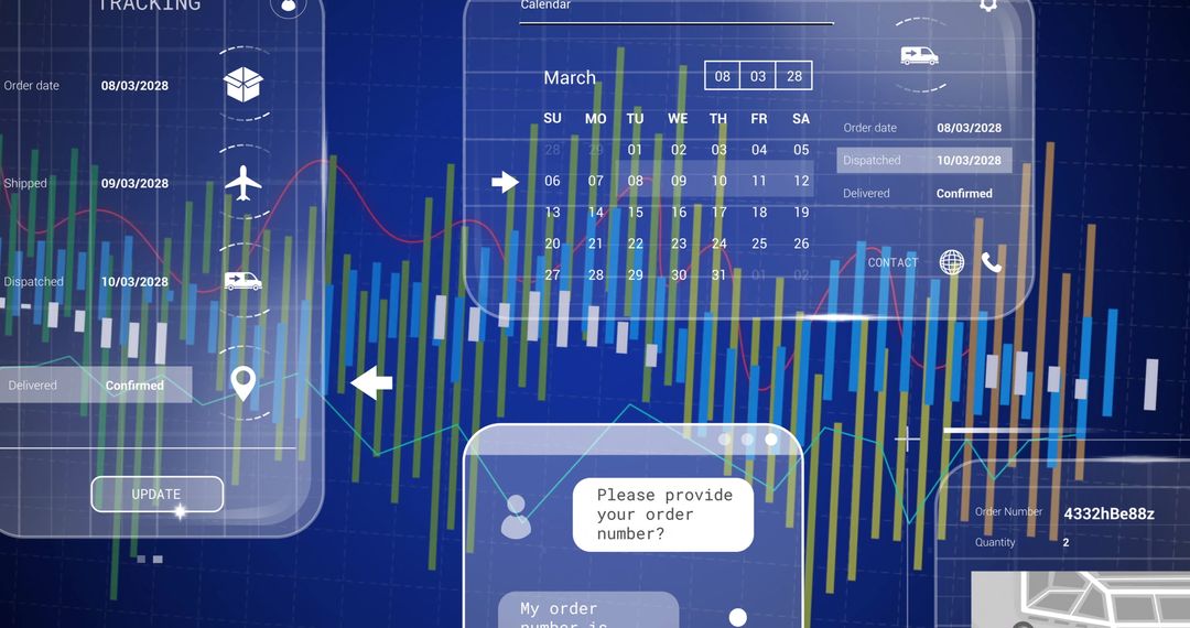 Digital interface showcases floating package tracking system aided by interactive calendar and shipping icons. Display conveys how businesses use real-time analytics for monitoring logistics performance. Ideal for illustrating modern business processes, logistics, shipping technology advancements, and the implementation of data dashboards in business operations.