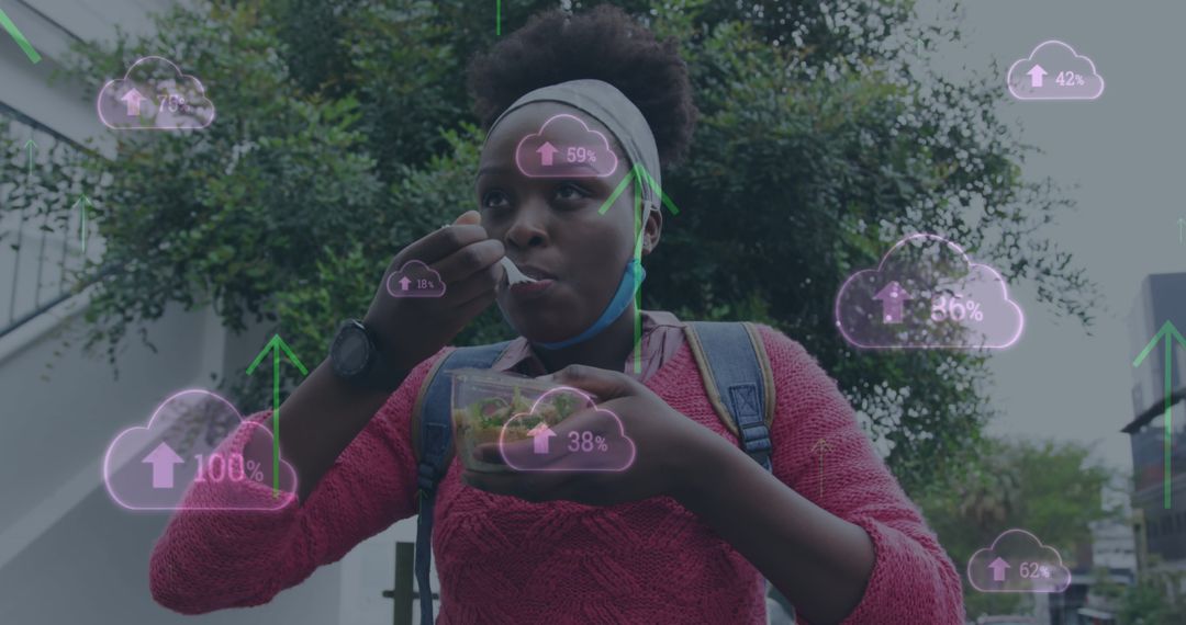 Digital Overlay and Urban Lifestyle: Woman Enjoying Takeaway Meal Image