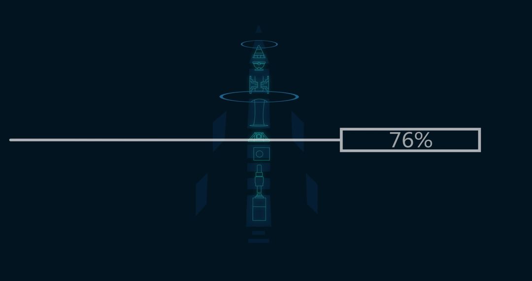 The image depicts a digital interface set against a black background, featuring a detailed rocket blueprint in neon colors with a progress bar displaying a 76% completion rate. Ideal for technology-themed projects, user interfaces, or digital presentations inspired by space exploration or data processing.