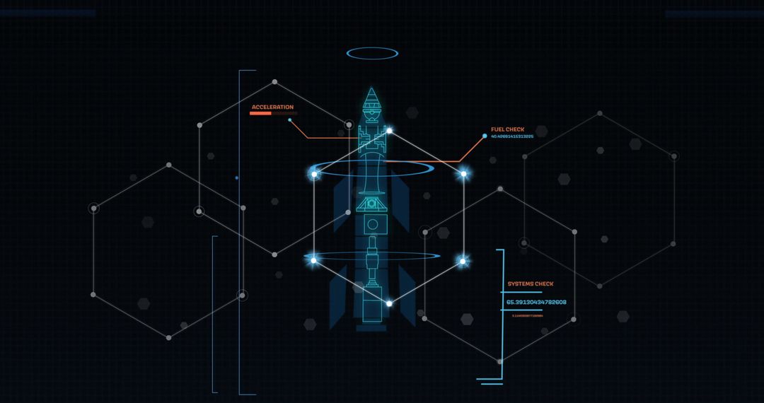 Futuristic digital display showing a rocket with interconnected hexagonal network and data nodes, emphasizing technology and innovation. Ideal for illustrating concepts related to technological advancement, data integration, sci-fi futurescapes, and aerospace engineering presentations.