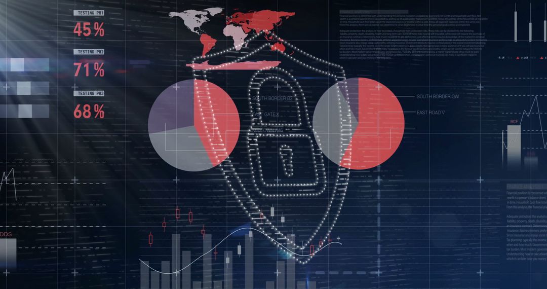 Depicting a futuristic digital security dashboard featuring a prominent dotted shield with a padlock, combined with pie and bar charts as well as a world map. The visuals emphasize elements like cybersecurity, data protection, and modern technology. Suitable for illustrating cybersecurity strategies, digital transformation concepts, and analytics tracking in digital communication articles or presentations.