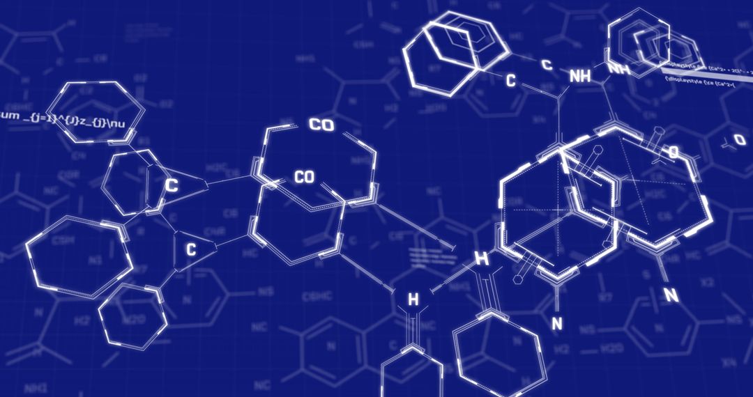 This concept showcases interconnected chemical structures on a digital blue background, signifying the intersection between science and technology. Suitable for educational materials, illustrations of scientific advancements, tech presentations, or marketing materials in academic and commercial settings.