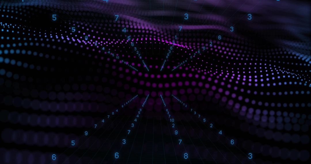 This dynamic visualization features waves of purple and blue dots spread across a virtual 3D grid with random numbers seemingly floating in the space. Suggesting a flow of data or information, it embodies themes of innovation and future technology, ideal for presentations on digital software, tech solutions, or progressive technological advances.